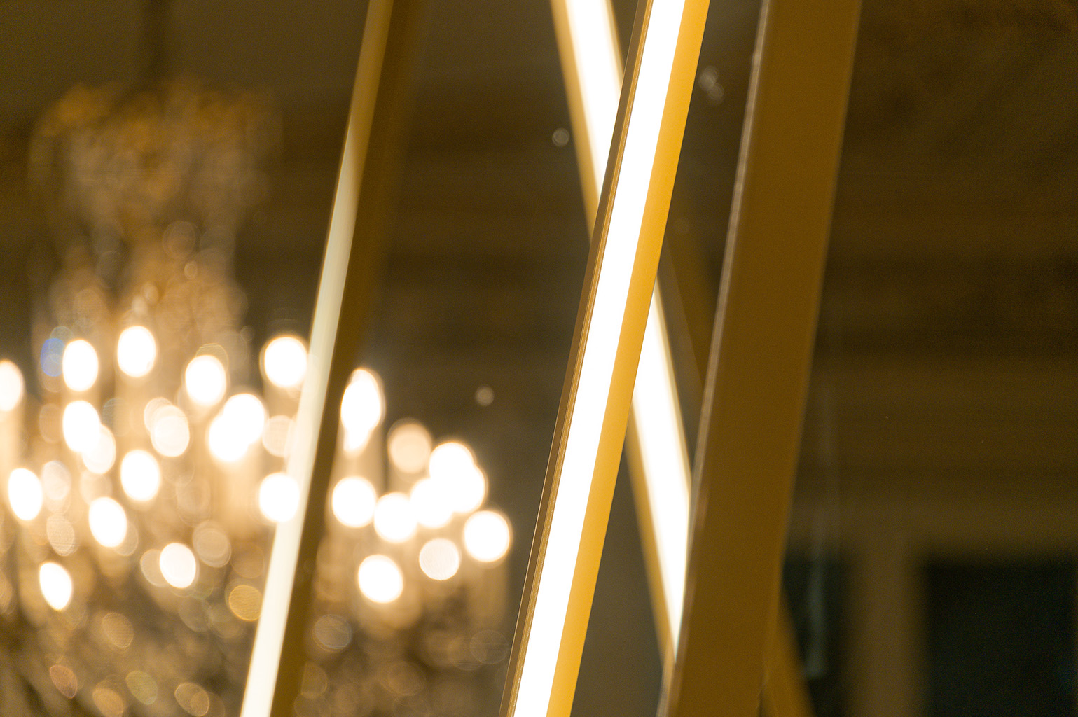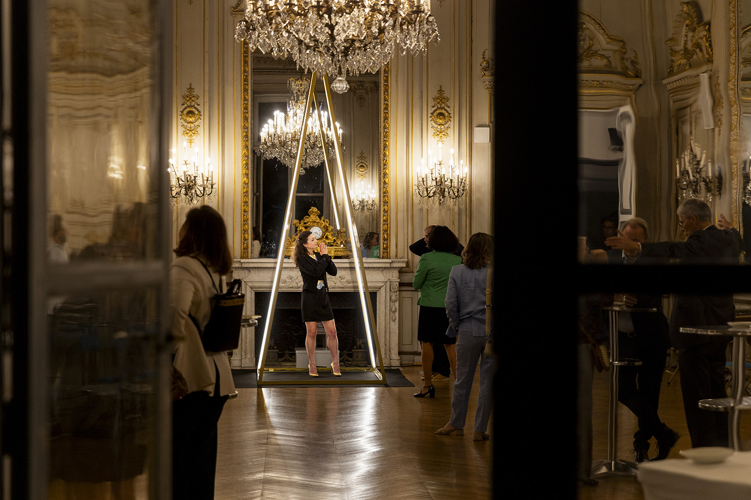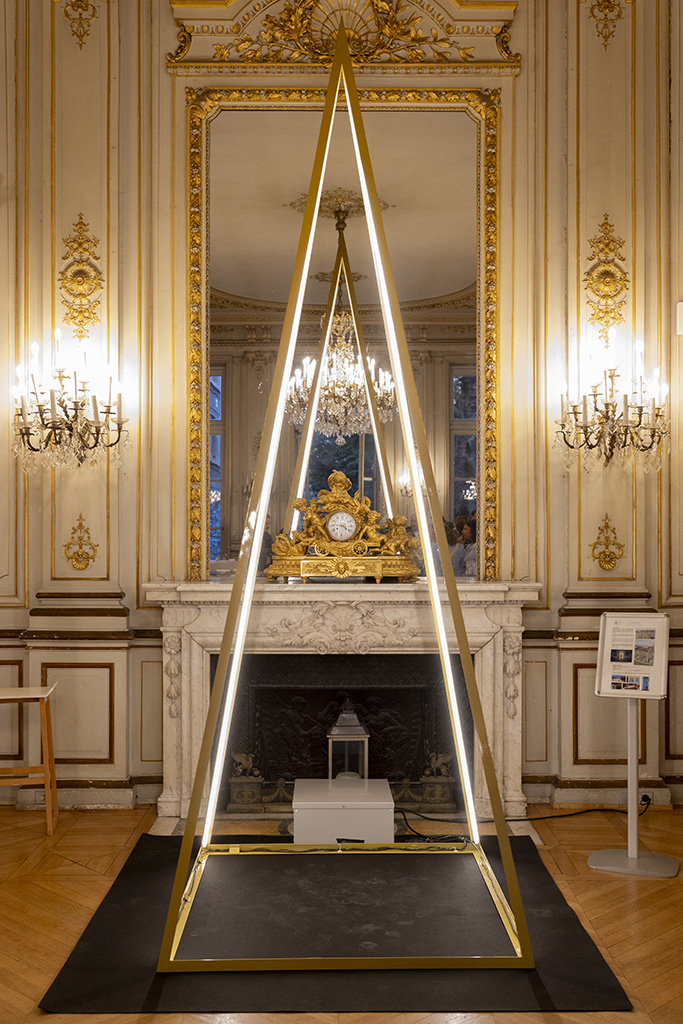 Katherine E. Fleming and Milène Guermont in the luminous artwork PYRAMIDION at the Ministry, photo by Damien Carles / SIPA press