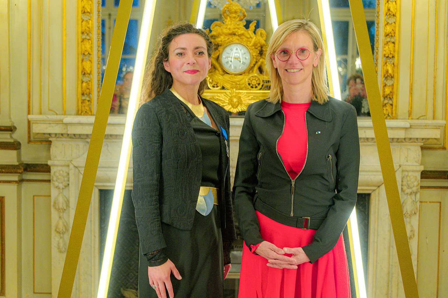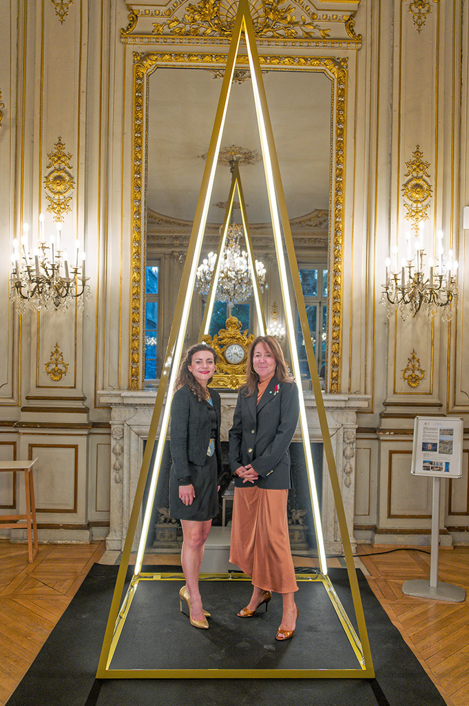 Katherine E. Fleming et Milène Guermont dans l'œuvre lumineuse PYRAMIDION au Ministère, photo par Damien Carles / SIPA presse